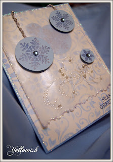 На фоновую бумагу с рисунком положила кальку. Под калькой несколько штампованных снежинок, аналогичных основным, приклеенным поверх кальки на вспененный скотч. Голубые круги со снежинками напоминают мне ёлочные шары... Большие и праздничные :) Поэтому смело участвую со своей ледяной открыткой в задании от Special Day Cards Ёлочные игрушки.